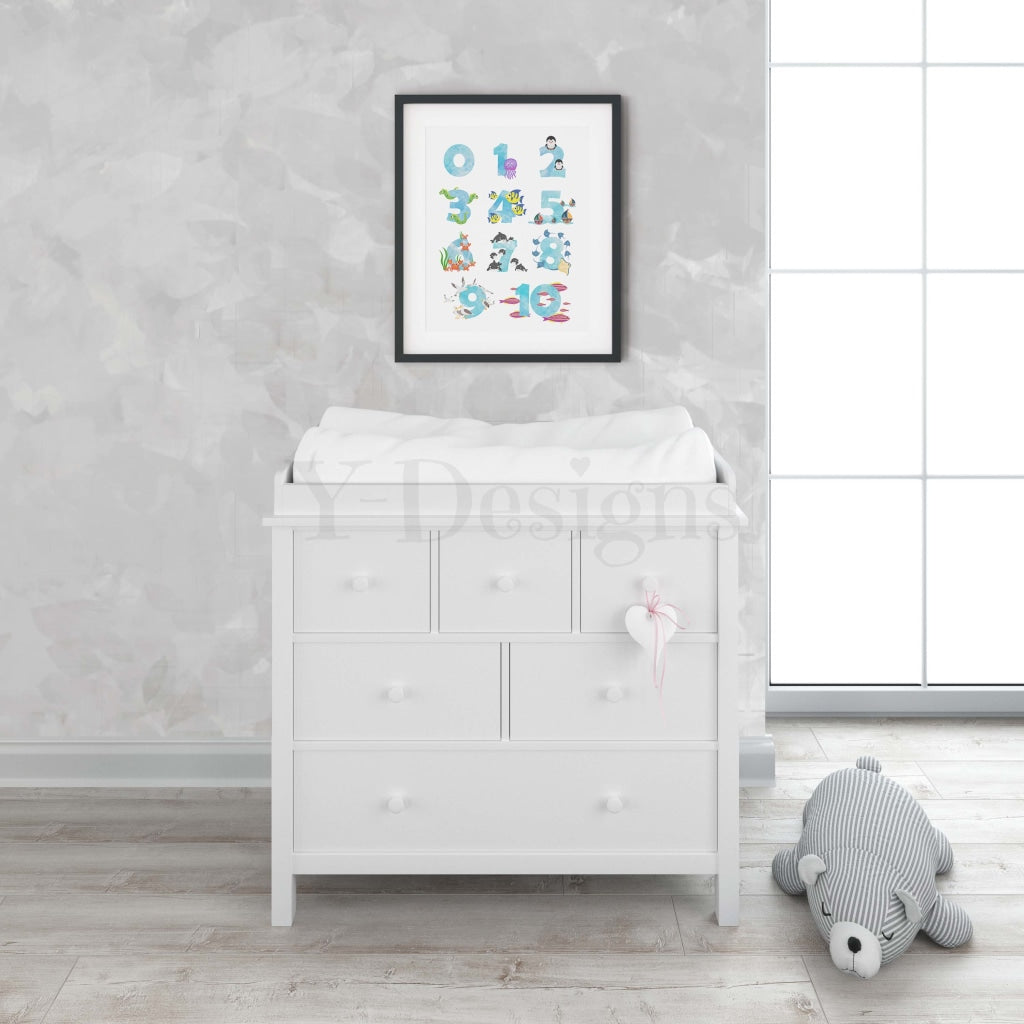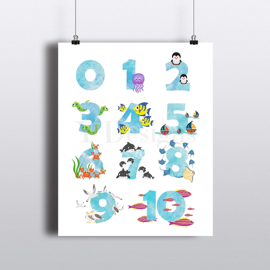 Bring this ocean sea themed 0-10 numbers wall art to your child's room. An ocean light blue color that is sure to inspire and help your kids learn their numbers.